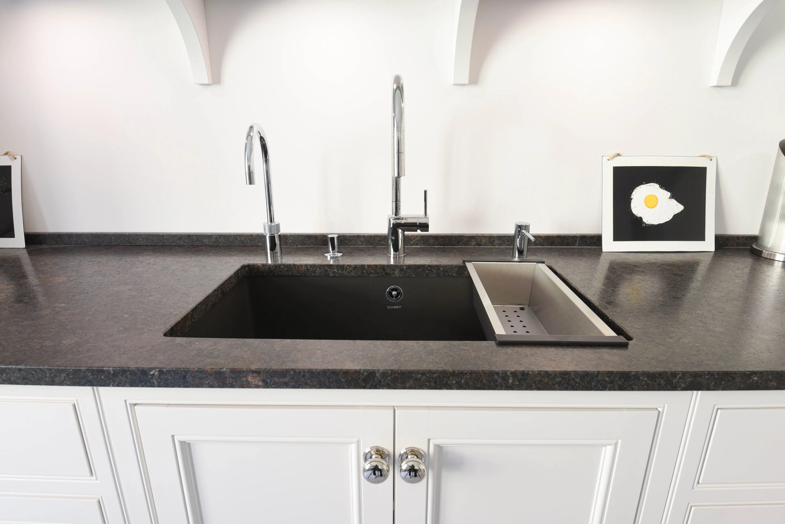 Diese vom Tischler gefertigte Landhausküche überzeugt durch ihr klassisches, zeitloses Design. Die detailreichen Rahmenfronten unterstreichen diesen Stil zusammen mit der aufwändig gestalteten Dunstabzugshaube und den Pilastern (Säulen). Die Knöpfe und Muschelgriffe der Küche sind glänzend verchromt und passen perfekt zur Armatur, dem Quooker und dem integrierten Spülmittelspender. Die großen Wandborde sind mit einem Streifen der Natursteinarbeitsplatte belegt, die auch für den Rest der Küche verwendet wurde.