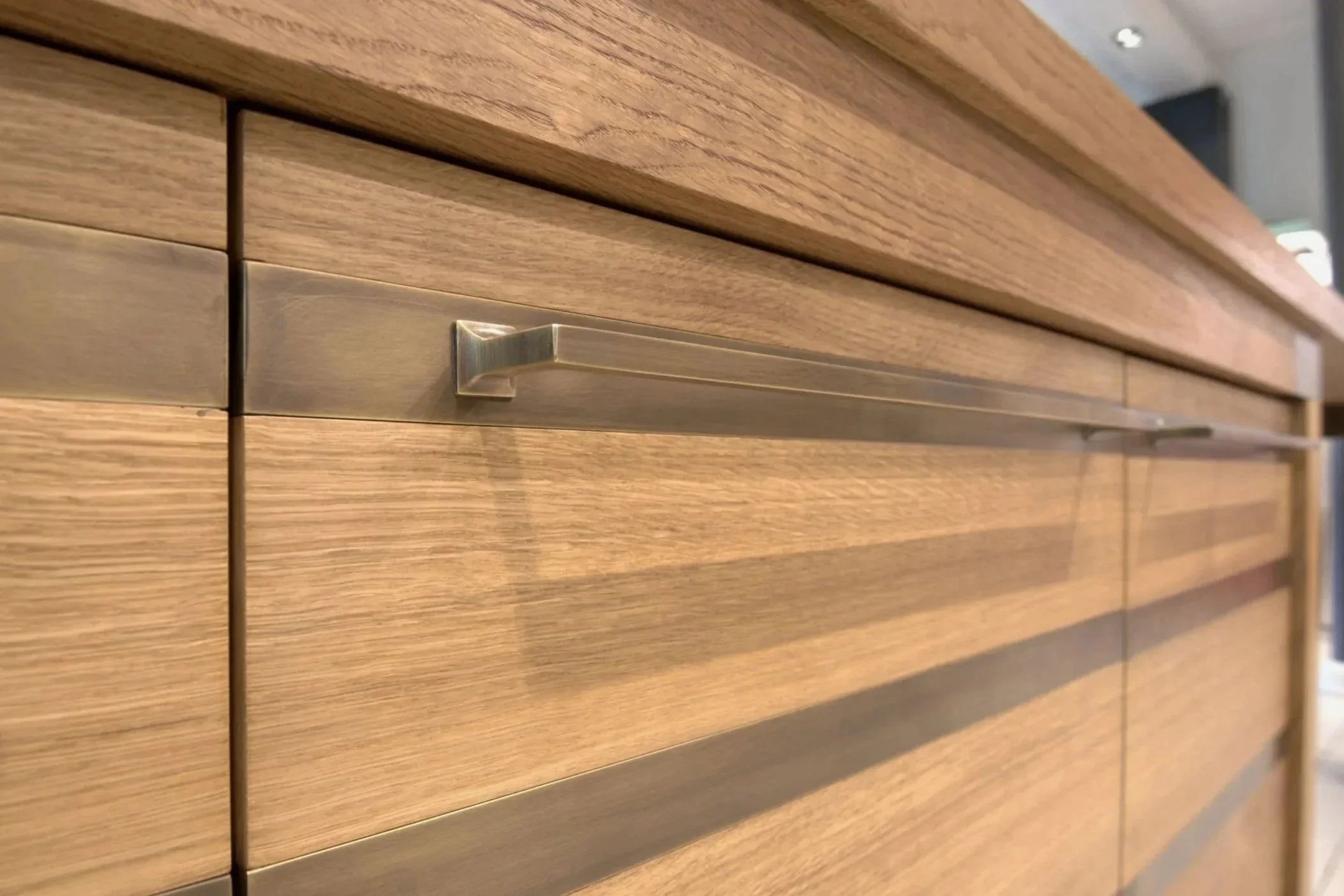 Handgefertigte Messingbeschläge: Die handgearbeiteten Beschläge aus Messing wurden speziell brüniert, um eine elegante, zeitlose Optik zu schaffen.
